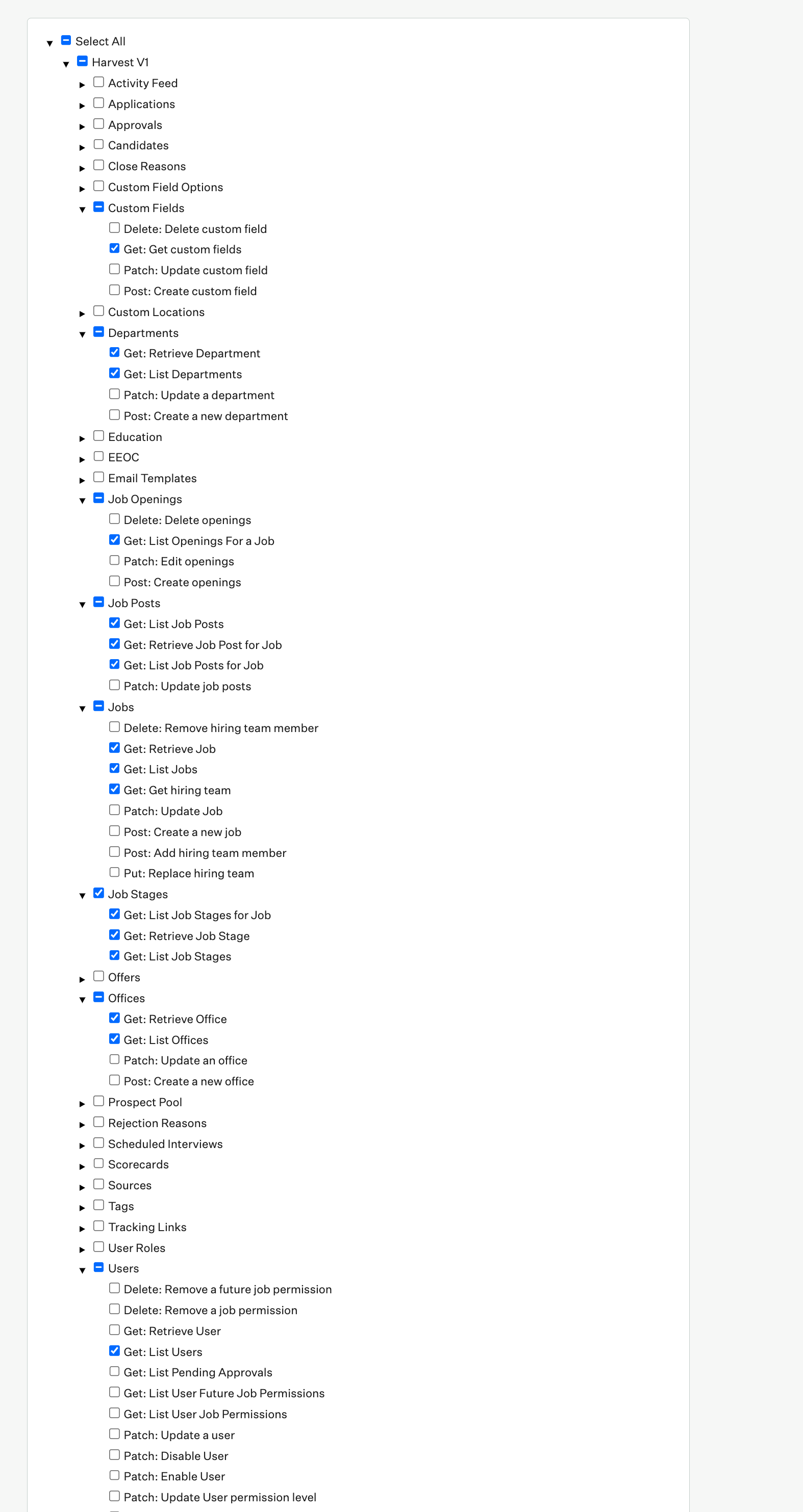 - Assign the required Harvest API v1 permissions as shown in the screenshot provided, then click Save.