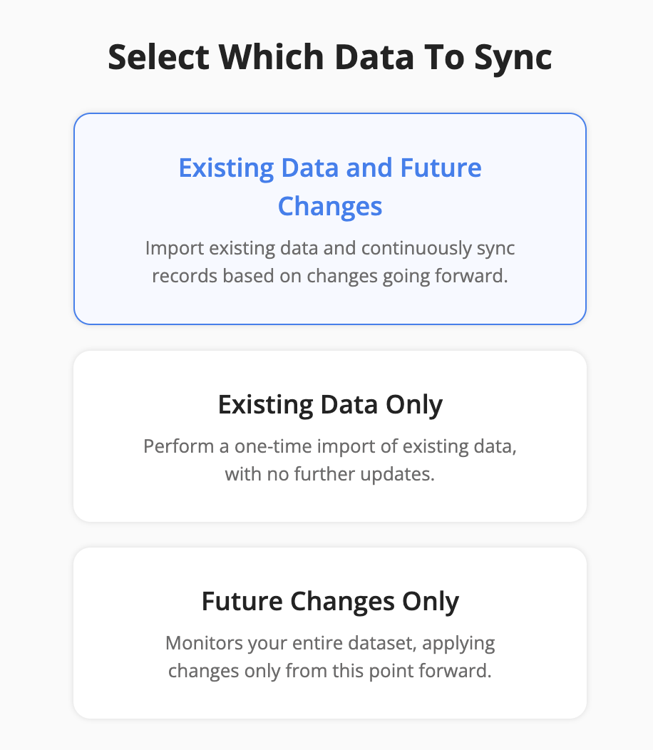Choose this option if you want a fully synchronized dataset that includes historical data and stays up to date with future changes.