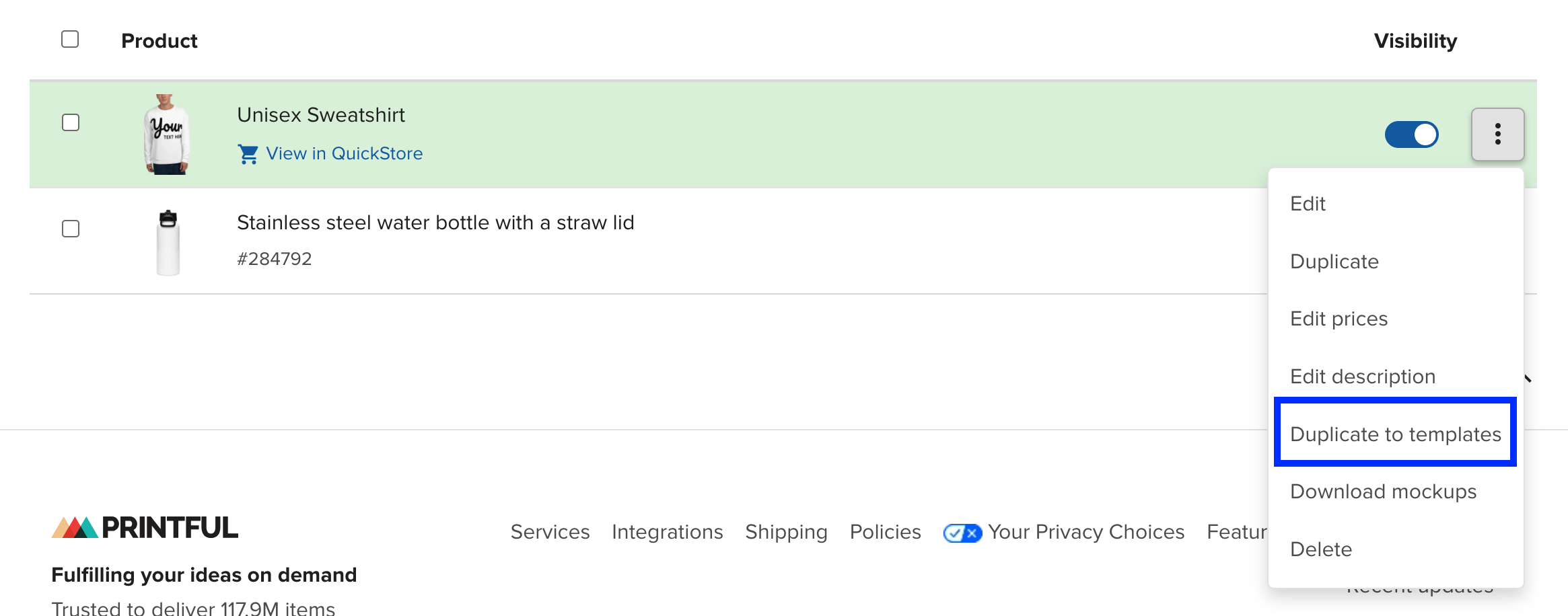 The good news is that Printful makes this process simple — you can duplicate your existing products in bulk (if supported by your store) and publish them to the new store type.