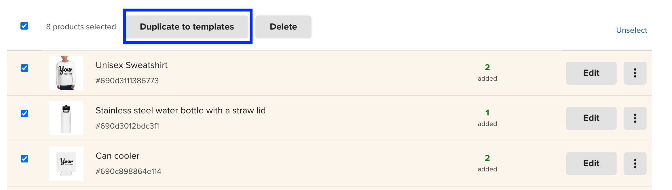 - Click "Duplicate to templates" to create templates for all selected products at once.